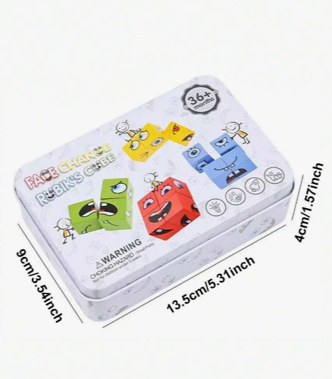 Juego cambia cara de expresiones, caja metálica según imagen y cubos de madera con las expresiones estampadas no con stikers.