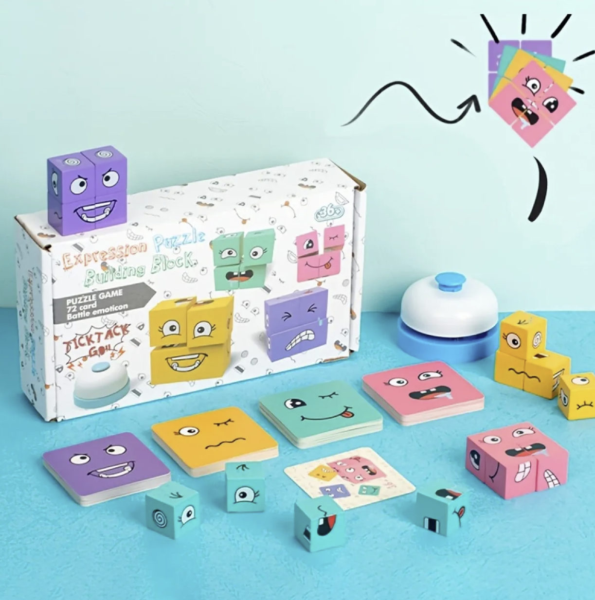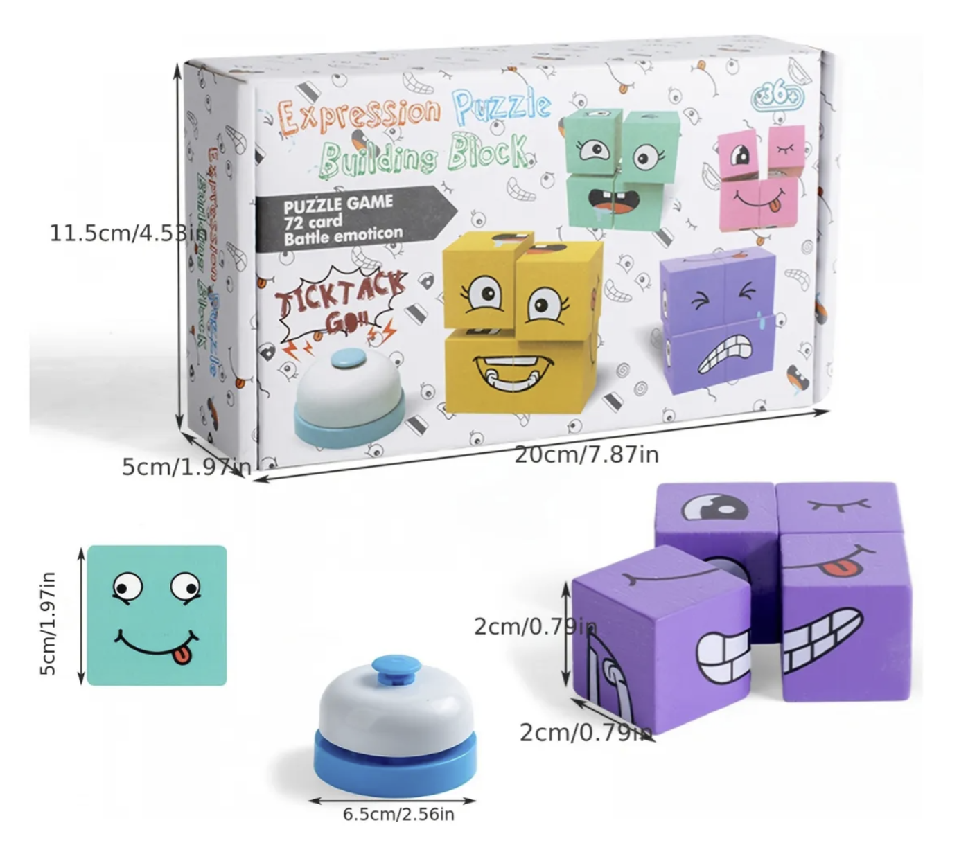 Juego cambia cara de expresiones, caja de cartón según imagen y cubos plasticos viene con timbre.